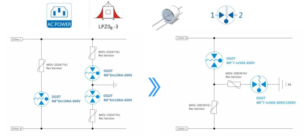 檳城電子開(kāi)創(chuàng)性地研究出電流敏感的OGDT器件可解決過(guò)壓保護(hù)器件失效短路問(wèn)題,可廣泛應(yīng)用于電源板載式SPD模塊、 外置式IP68SPD模塊、 軌道交通行業(yè)端口脫扣電路、 AC電源口大通流量脫扣電路、 新型TMOV等多個(gè)防護(hù)場(chǎng)合。